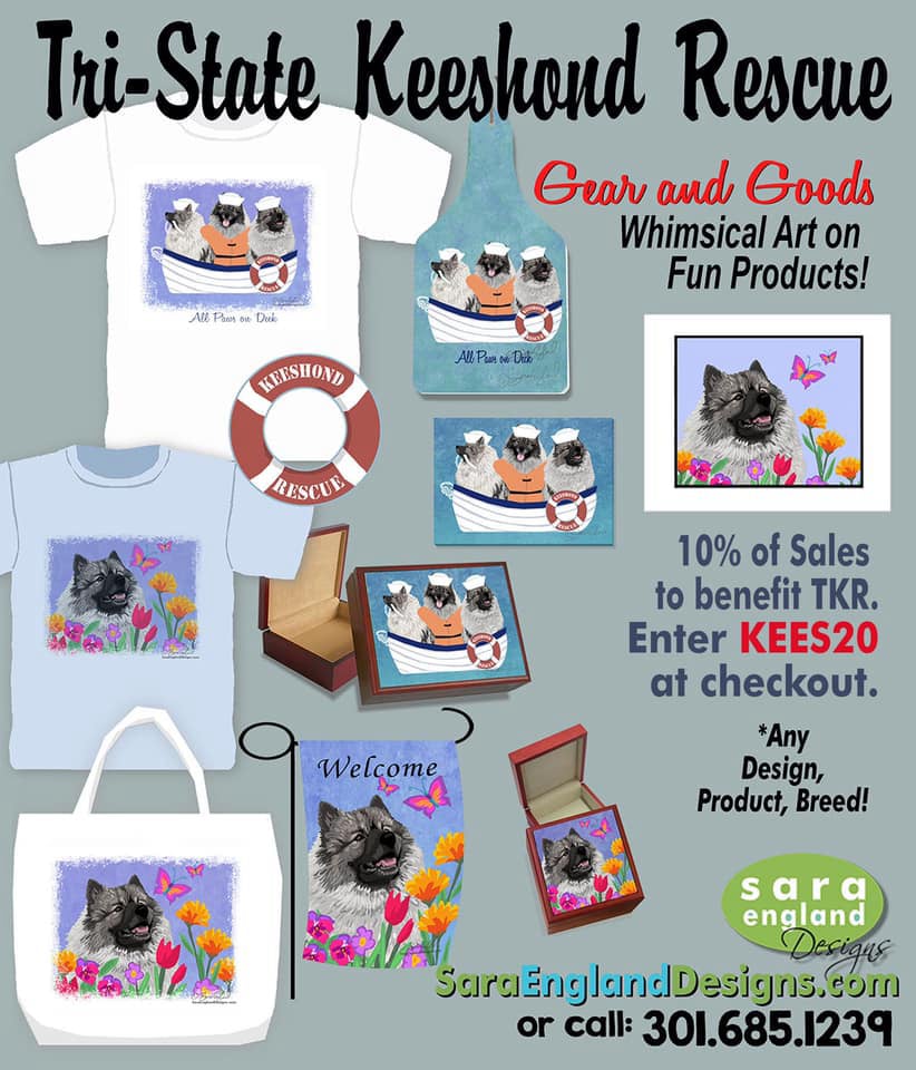 Sara England Designs has graciously added us as a beneficiary of purchases of her products. If you use the KEES20 at checkout Tri-State Keeshond Rescue will receive 10% of the sale. Just click on the picture above or the LEARN MORE below to go to her site.